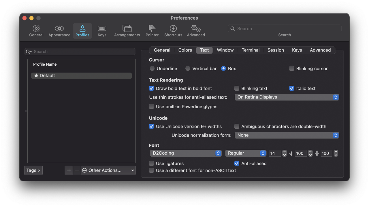 터미널에서 command + , 를 입력 후 폰트 변경