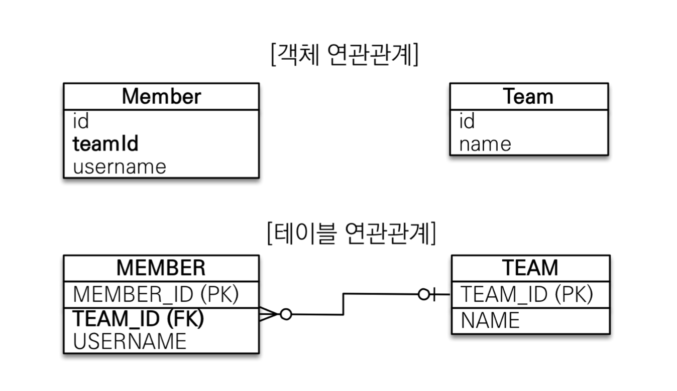 - 테이블은 외래 키 조인을 사용해서 연관된 테이블을 찾는다