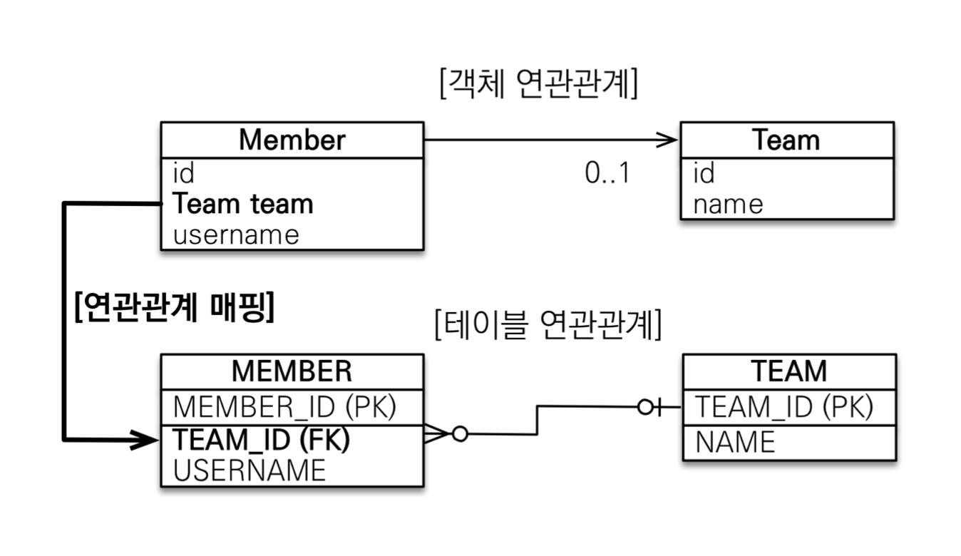 - 회원 객체(Member)는 Member.team 필드(멤버 변수)로 팀 객체와 연관관계를 맺는다