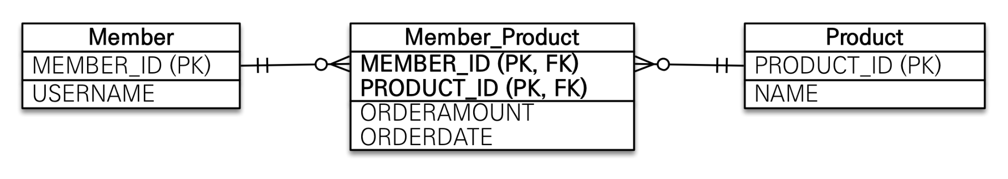 위와 같이 연결 테이블에 주문 수량(ORDERAMOUNT)나 주문 날짜(ORDERDATE) 컬럼을 추가했다.