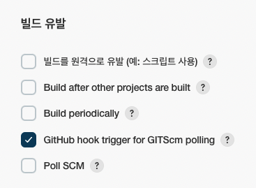 마지막으로 빌드 유발 섹션에서 GitHub hook trigger for GITScm polling을 선택하고 저장한다.