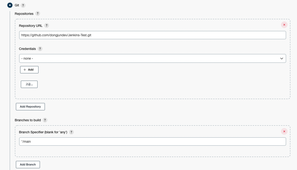 소스 코드 관리 섹션에서 아래 그림처럼 Git 클릭 후 리포지토리 URL과 Branch Specifier를 적어준다.