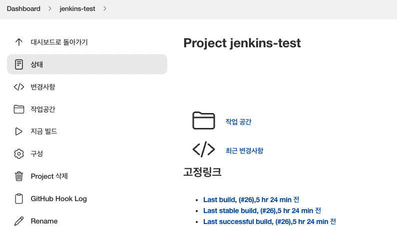 이제 깃허브 설정은 끝났다. 젠킨스 메인 화면으로가자.