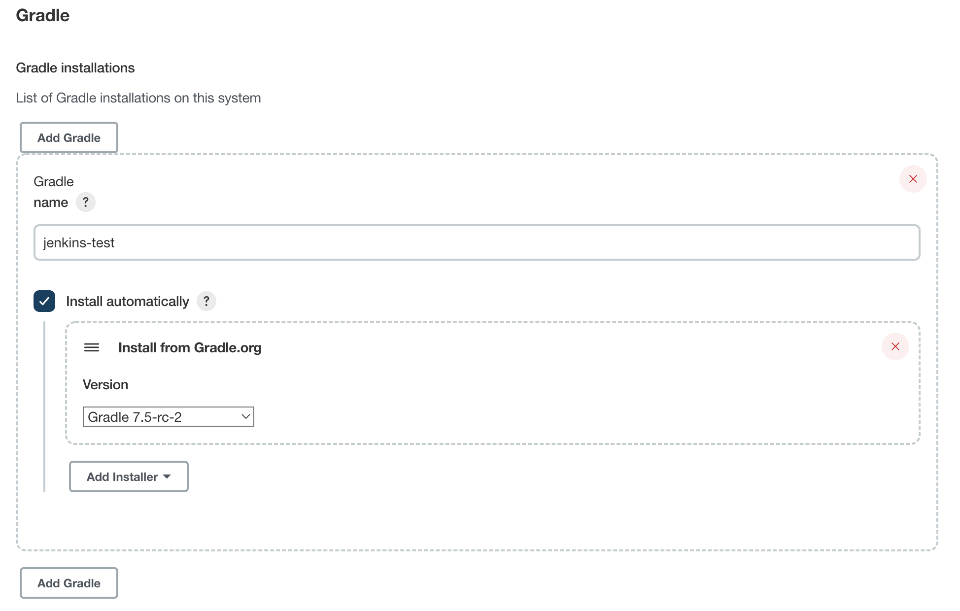 젠킨스 메인화면 Jenkins 관리 -> Global Tool Configuration -> Gradle (Gradle installations...)로 들어가서 아래와 같이 원하는 Gradle Version을 선택하고 저장하면 빌드에 필요한 Gradle 설치는 끝난다.