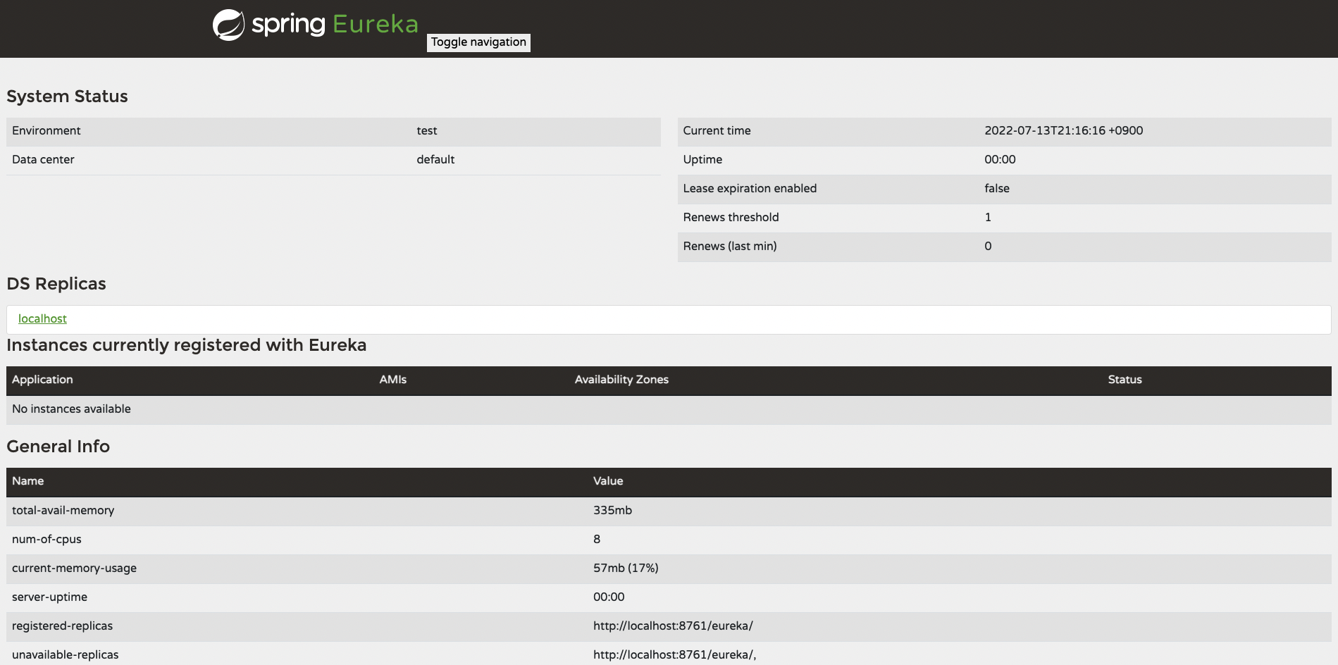 서버를 구동시키고 http://localhost:8761로 접속하면 아래와 같이 Eureka Dashboard를 볼 수 있다.
