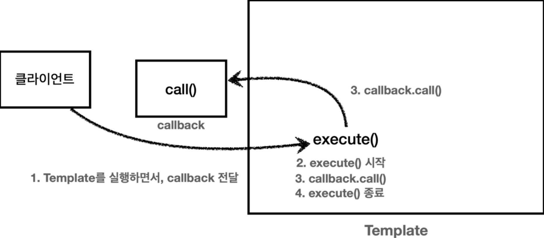위에 코드들을 보면 template.execute(~)로 전달받은 Callback의 call()함수를 전달받은 template 클래스 뒤에서 실행하고 있는 것을 볼 수 있다. 그림으로 보면 아래와 같다.