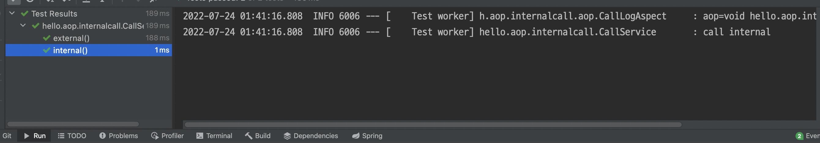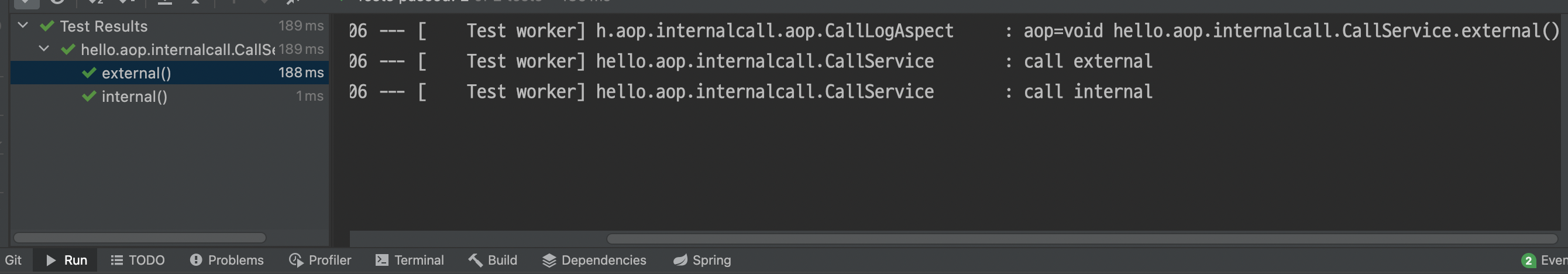 callService.external() 호출 시, 내부 호출한 internal()에는 aop 로그가 안 찍힌 것을 볼 수 있다.