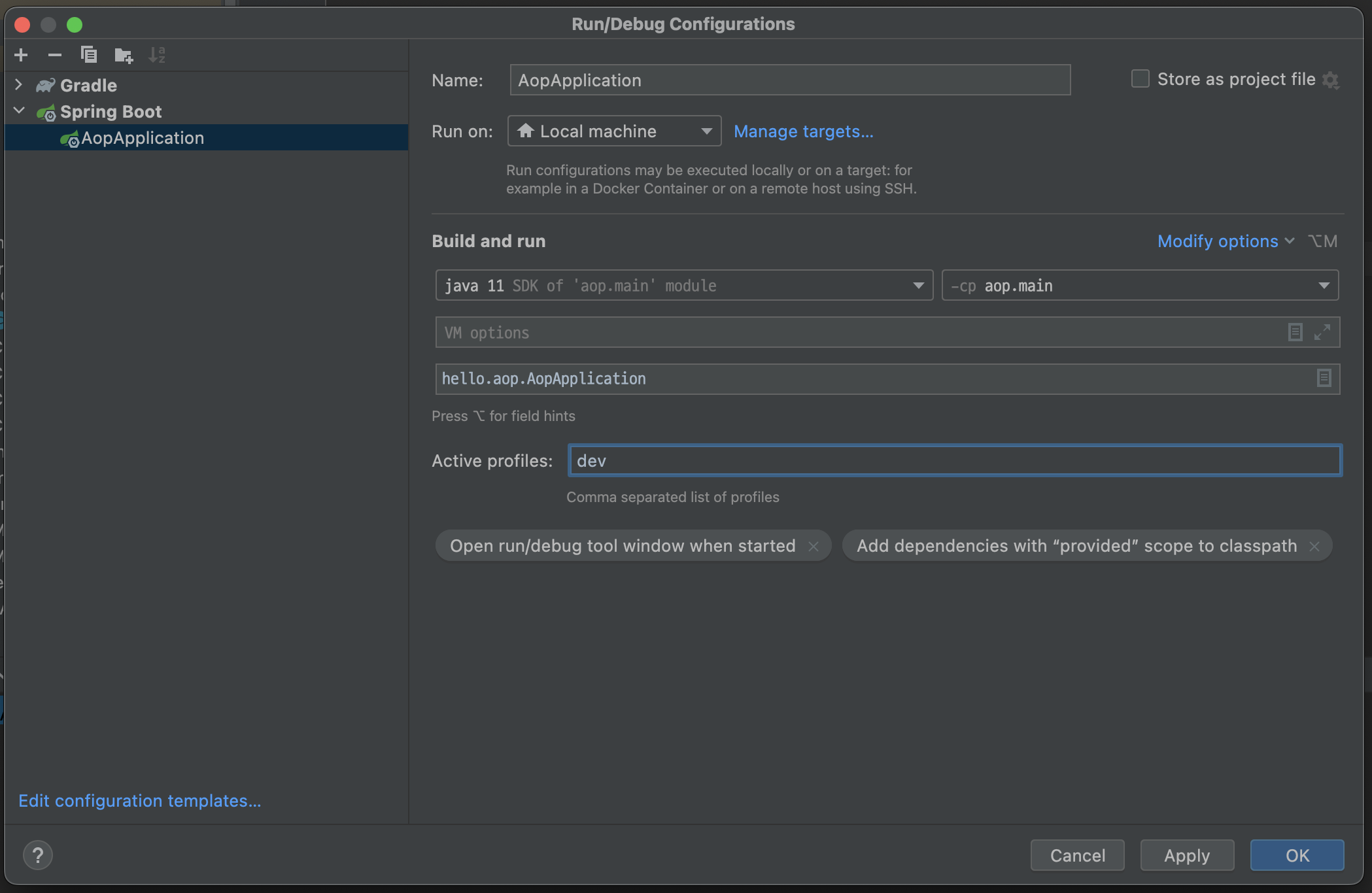 - Active profiles에 실행할 profile 명 입력 후 실행