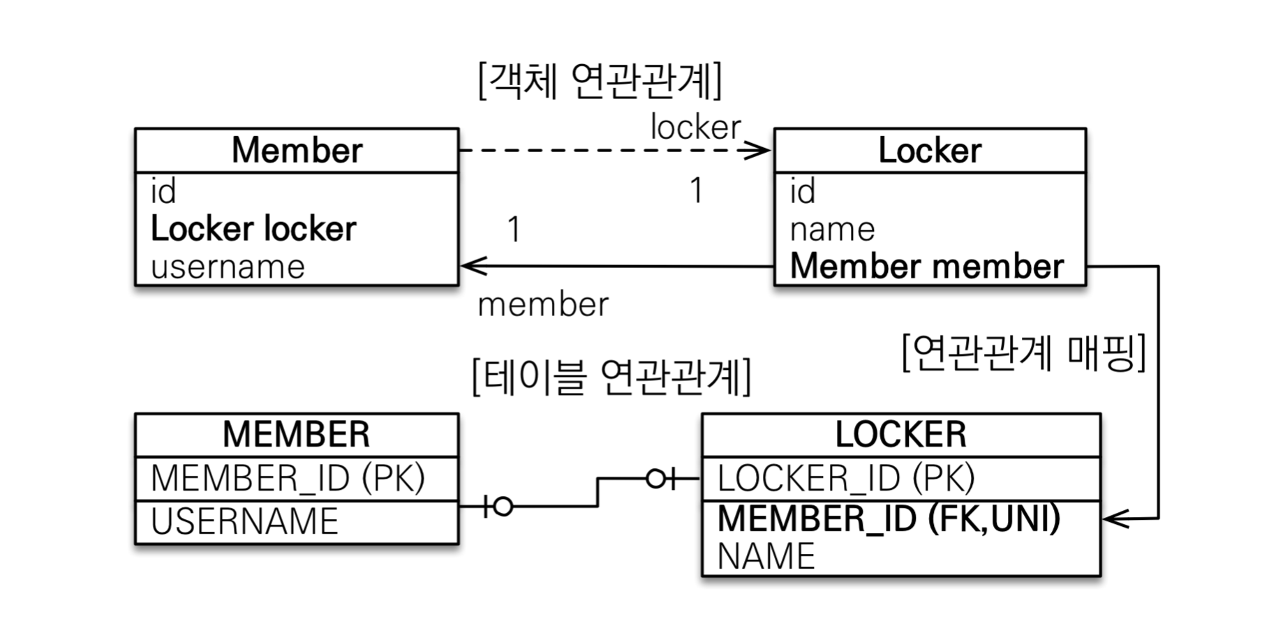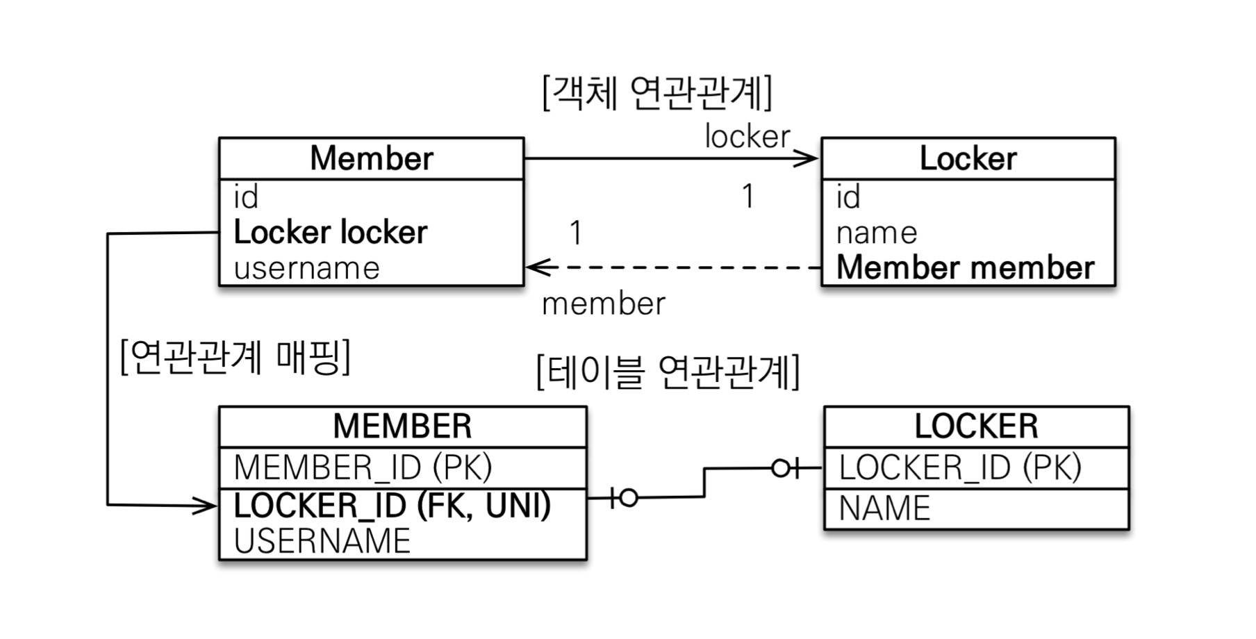 양방향이므로 연관관계의 주인을 정해야 한다. MEMBER 테이블이 외래 키를 가지고 있으므로 Member 엔티티에 있는 Member.locker가 연관관계의 주인이다.