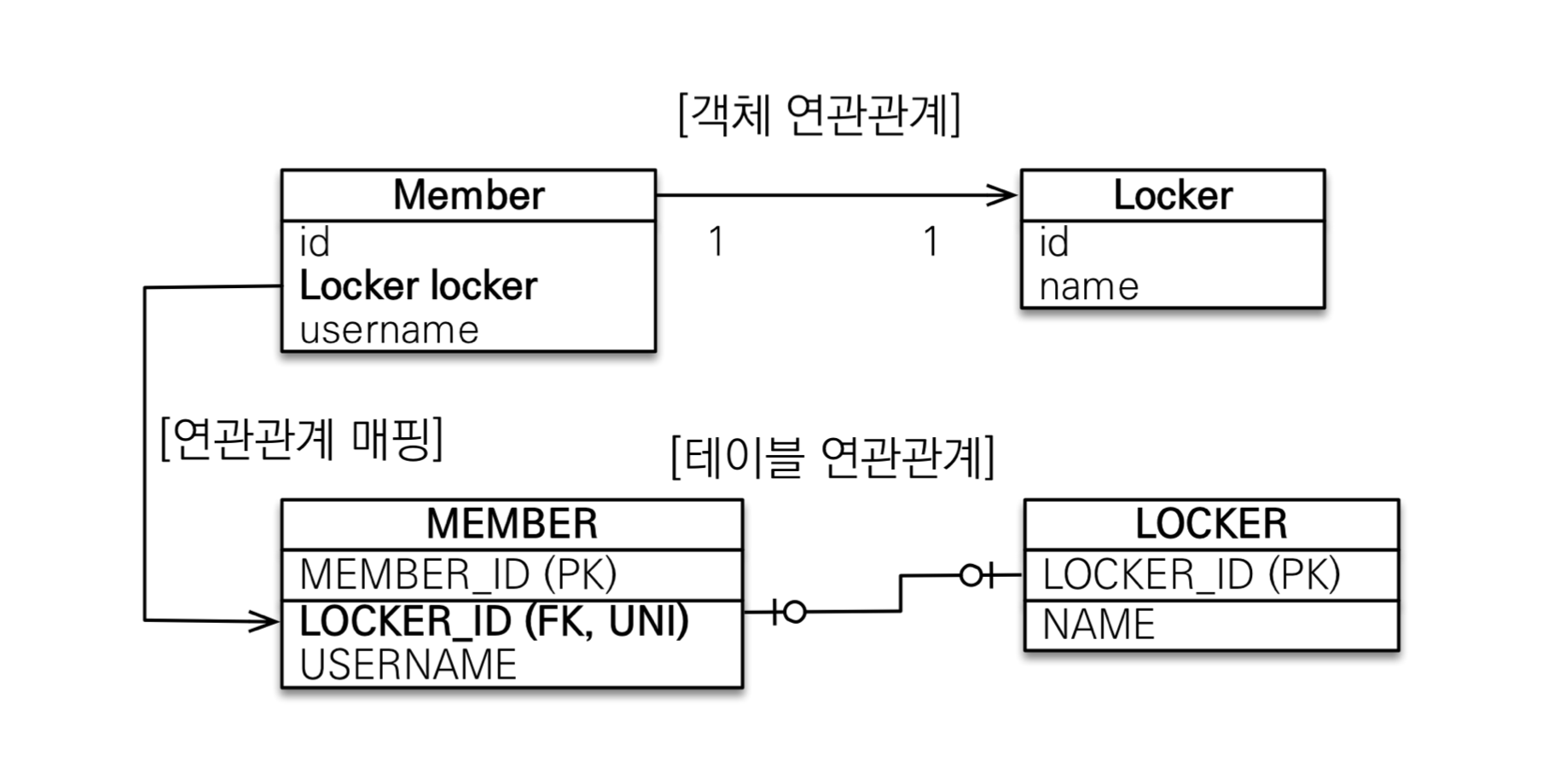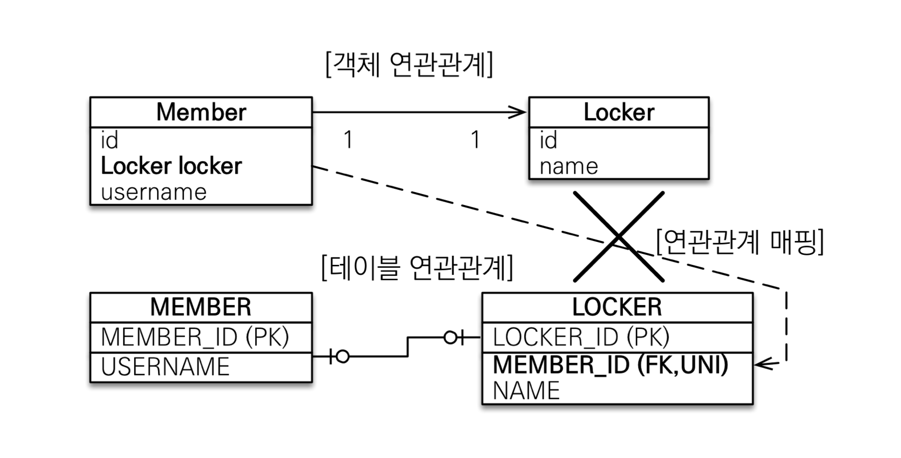 회원은 하나의 Locker만 가지고, Locker는 하나의 회원에 의해서만 사용되는 경우이다.
