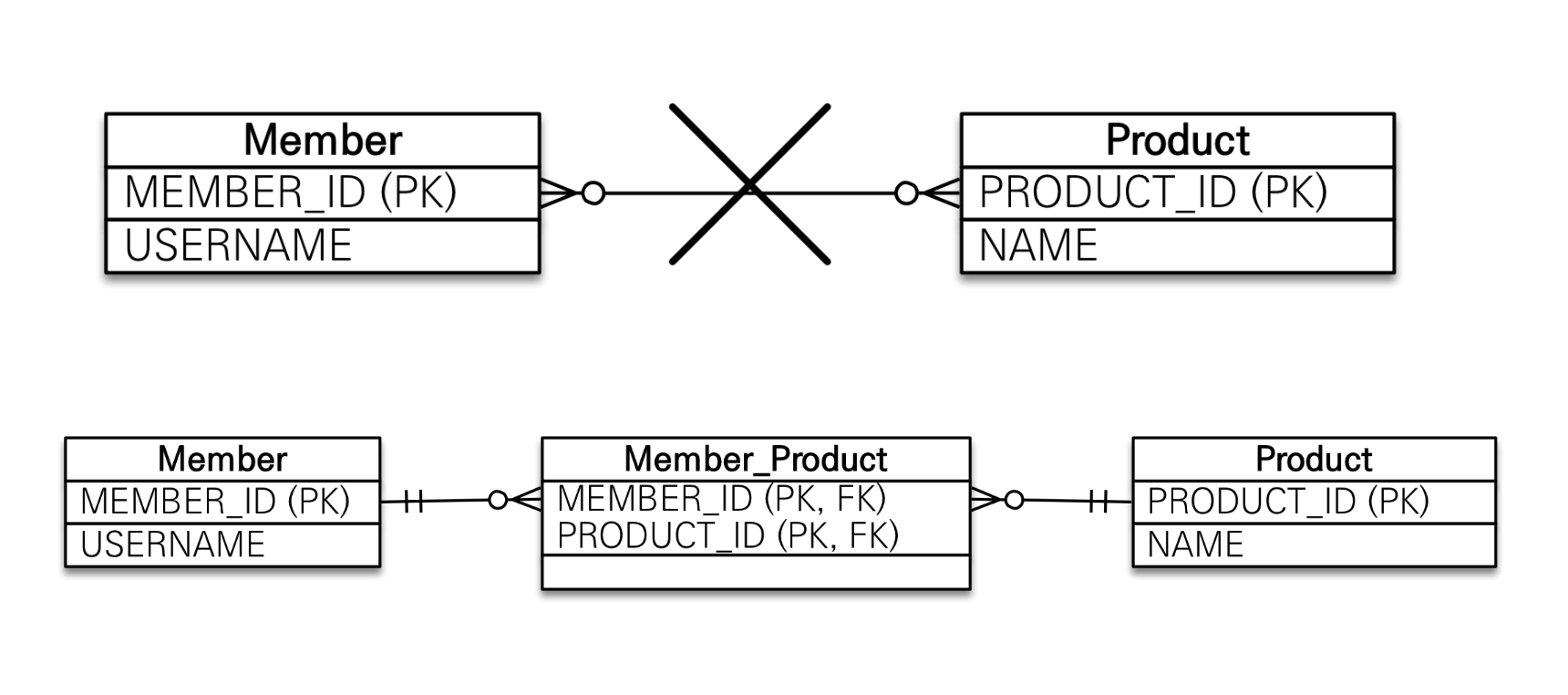 관계형 데이터베이스는 정규화된 테이블 2개로 다대다 관계를 표현할 수 없다.