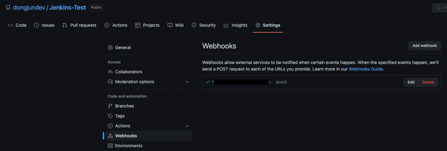 그리고 깃허브 리포지토리의 Settings 눌러 webhook 탭을 클릭하고 Add webhook 버튼을 누른다.