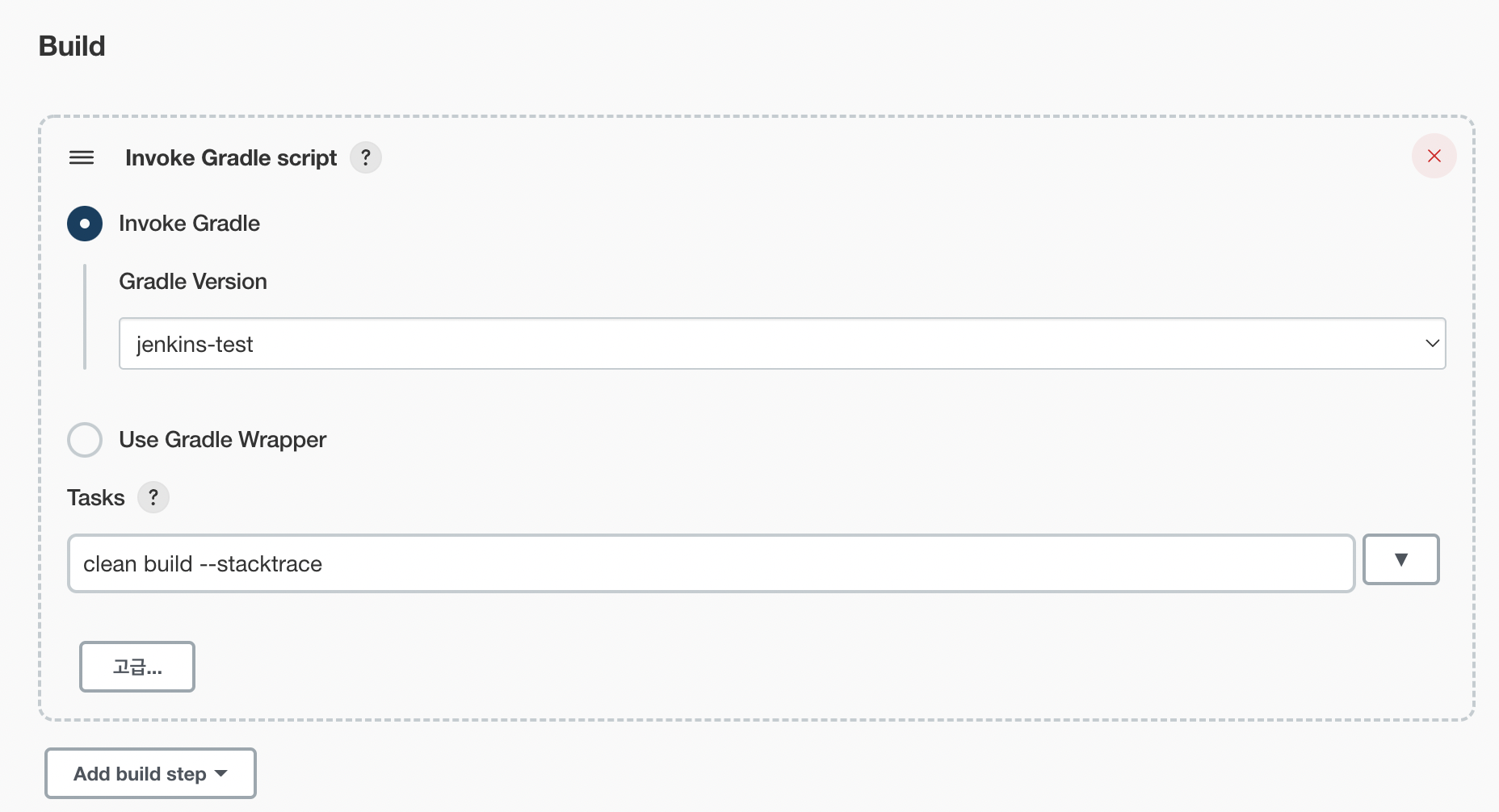 그리고 만들어 놓은 아이템의 구성에 들어가서 Build 섹션에 Add build step -> Invoke Gradle Script를 선택하고 아래의 그림과 같이 설정해준다.