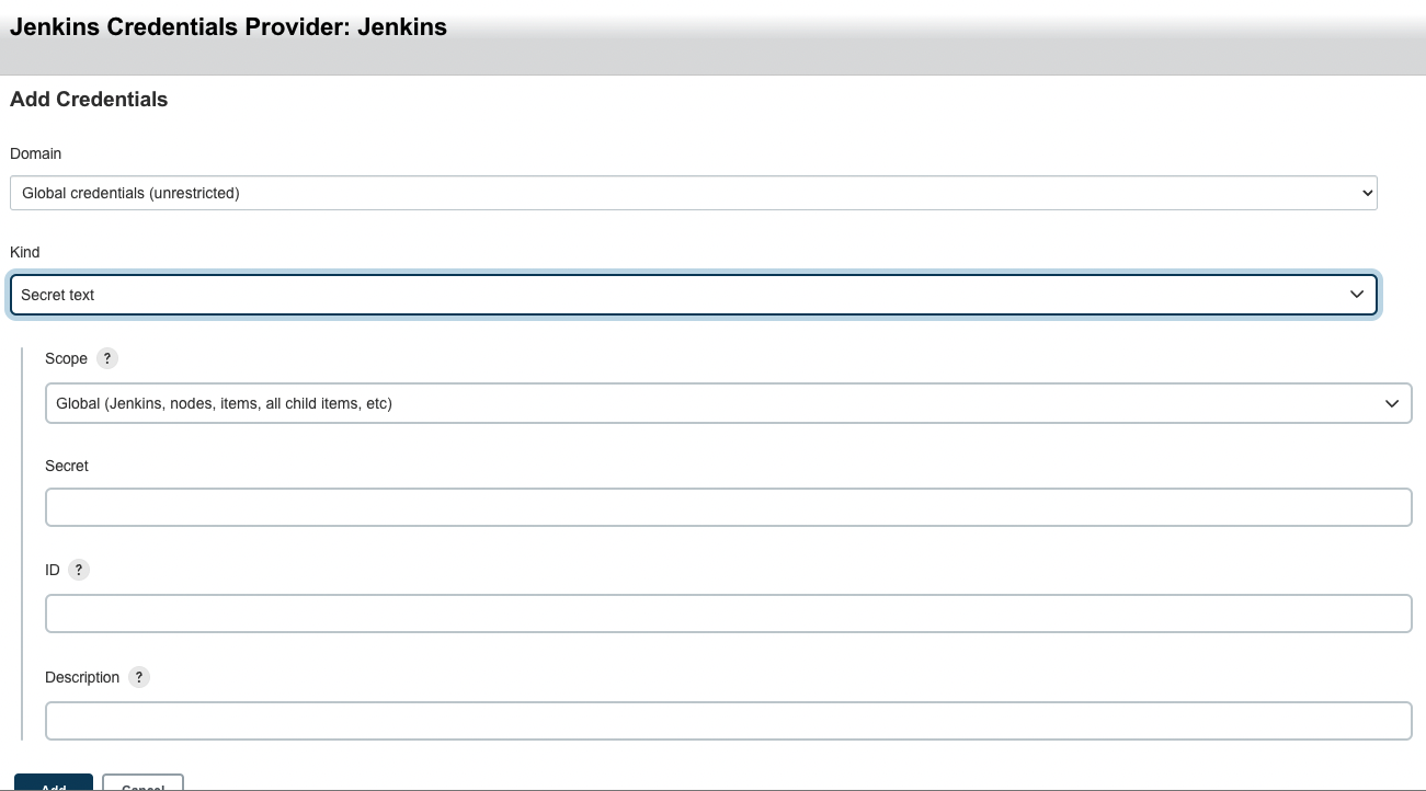 Kind를 Secret text로 설정하고, Secret에 위에서 복사한 토큰을 입력한다. 그리고 ID에 자신의 깃허브 ID를 적고 Description도 적어준 후, Add 버튼을 누른다.
