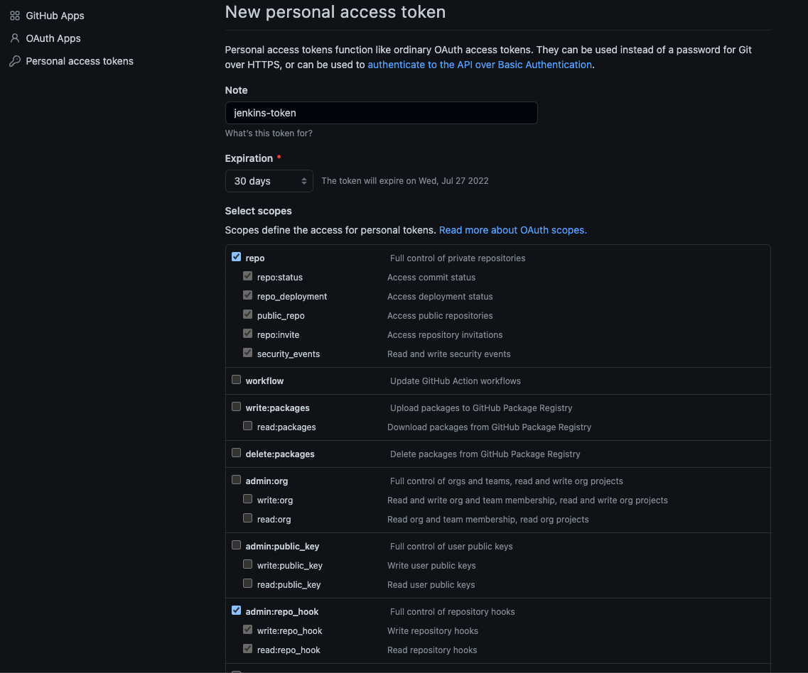 그리고 아래 사진과 같이 설정한 후 토큰을 발급 받는다. 발급된 토큰은 꼭 복사해서 잘 저장해두자.