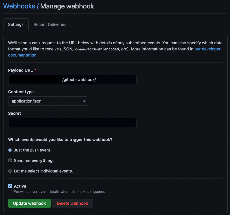 그리고 아래 그림과 같이 설정후 Update webhook 버튼을 누른다.